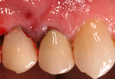 The tooth has been removed and a temporary tooth immediately placed on the implant.